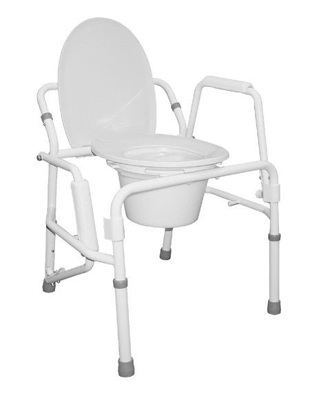 The 3 in 1 drop arm commode M370 comes with a powder-coated finish. Its has sturdy welded construction requires no assembly. It's arms drop down to allow easy side access. Comes with armrests, back post, splash guide and bucket with cover.