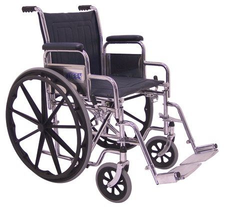 The Tuffy Deluxe 877 is well crafted to provide comfort and durability for all users. With its durable chrome plated frame, 24" molded rear wheels, 8' molded casters, and double embossed upholstery padded armrests and calf pads, it is the best choice for both rental and sale.